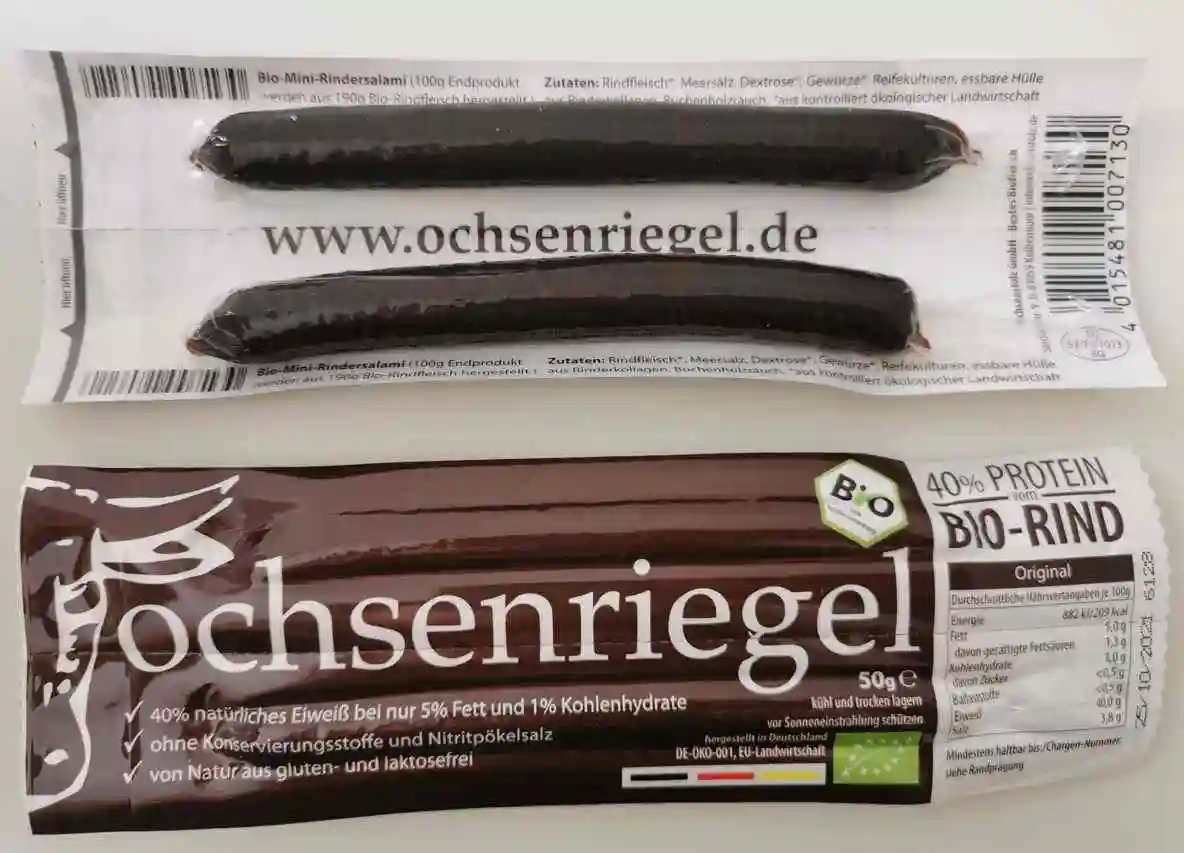 Als Ochsenriegel Alternative eignen sich die BEE FIT UP Bio-Mini-Rindersalami. Sie enthält etwas mehr Fett. Und ist im Ochsenriegel Preisvergleich sind etwas günstiger.